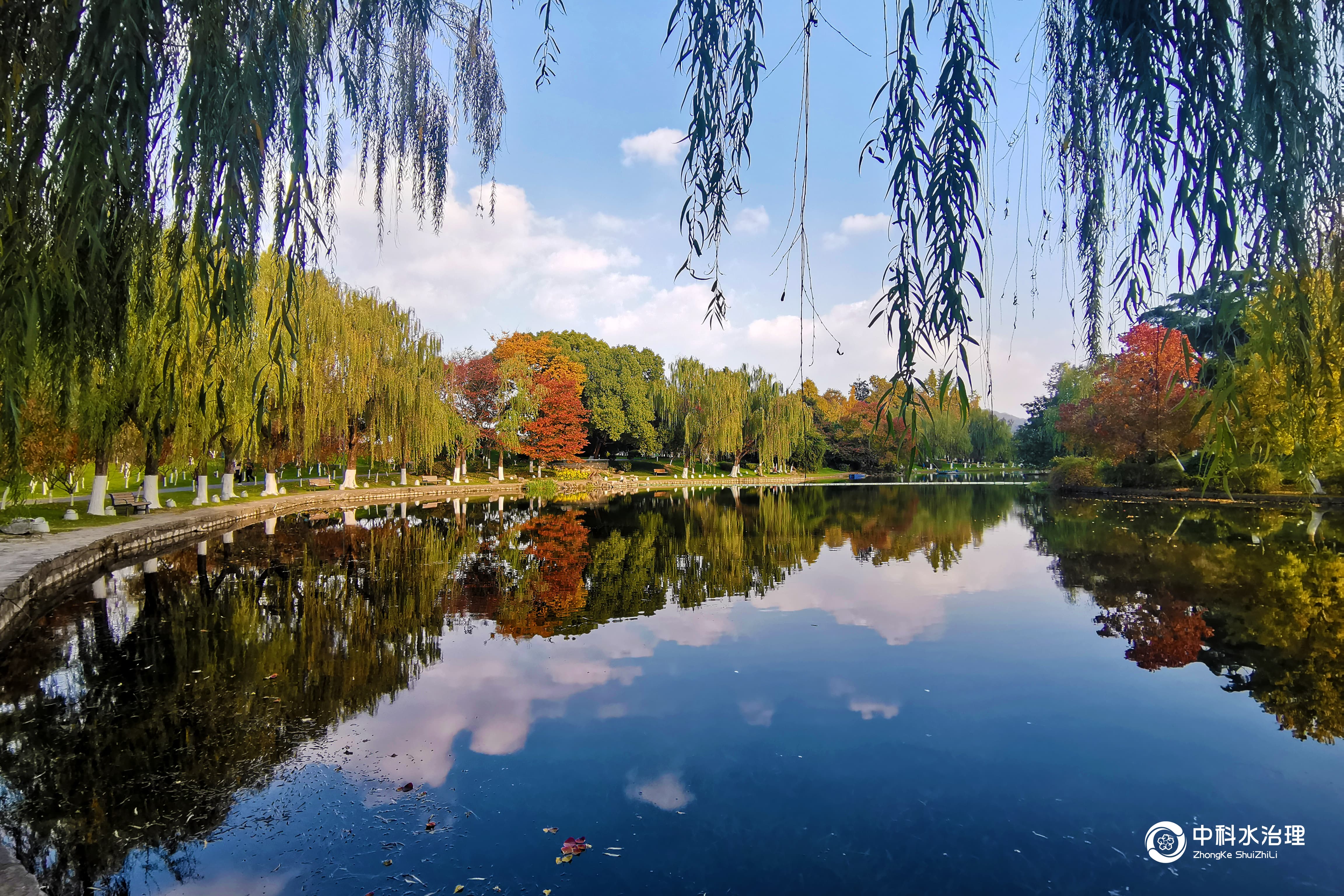 湖面水光瀲滟,湖堤上植被色彩斑斕