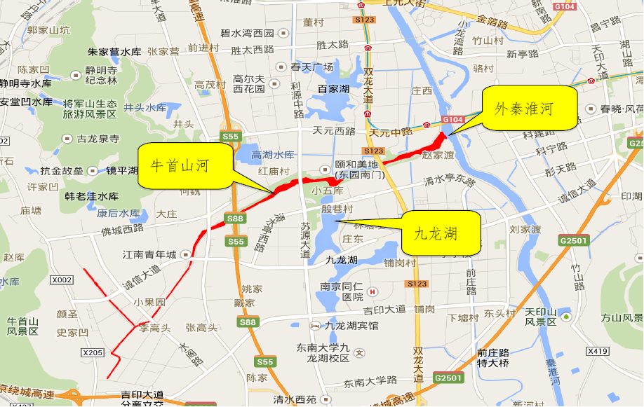 牛首山河自司家橋至石家垾而匯入秦淮河,河全長8.8km,流域面積46.4km2,作為防洪排澇河道,控制河底高程4-5.5m,河底寬5-20m